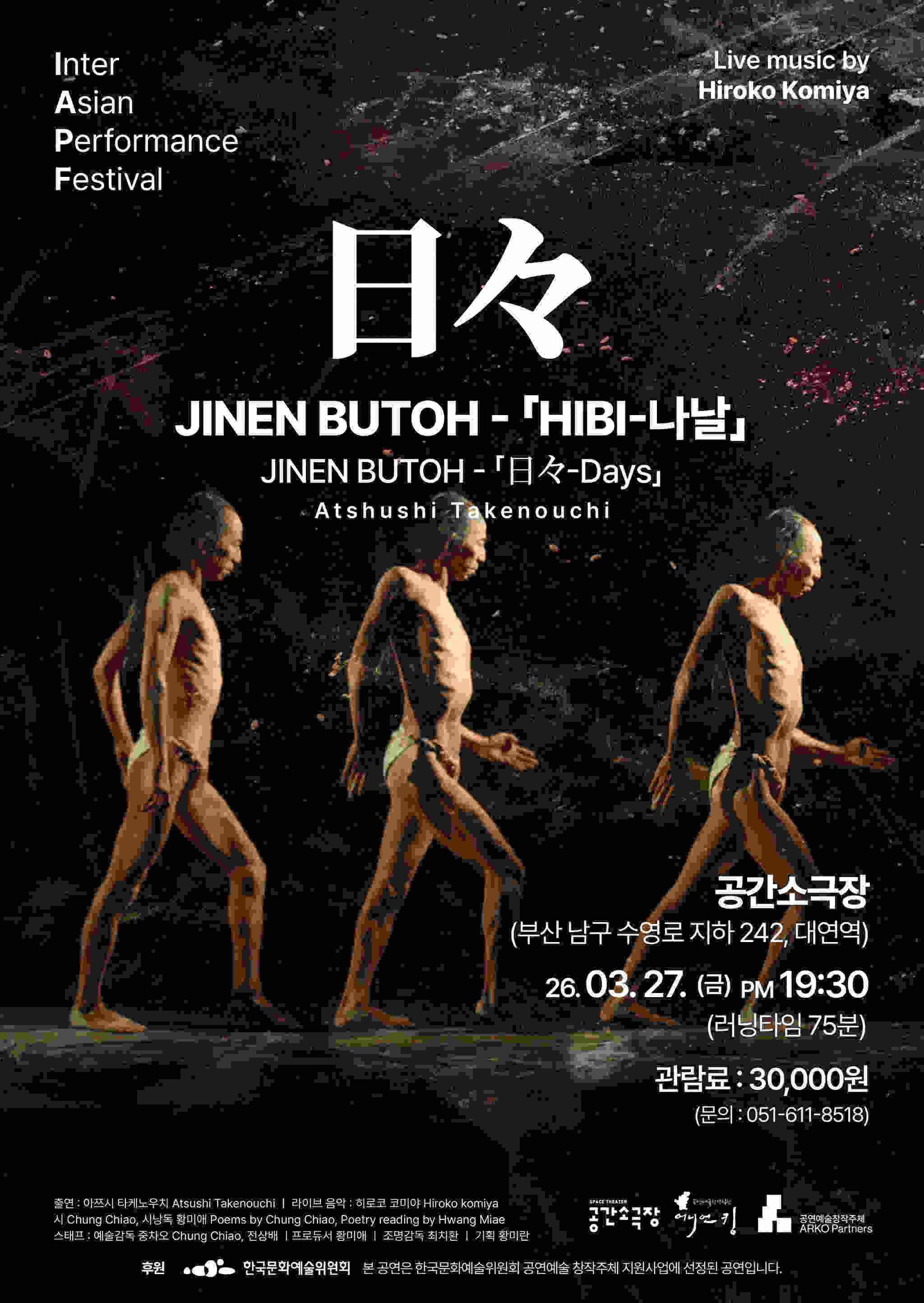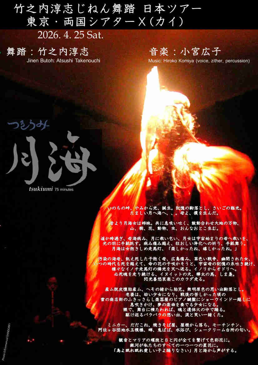 <contact> butoh.spazionu@gmail.com SPAZIO NU - DANCE & MOVEMENT, www.spazionu.com Pontedera (PI) Italy JAPAN - Spring 2025 JINEN Butoh in Japan - Sat 25 Apr 2025 / Ryogoku, Tokyo / Theater X (cai) Jinen Butoh performance < 海月- UmiTsuki > Doors 18:30 / Start 19:00 Butoh:Atsushi Takenouchi live music: Hiroko Komiya ![]() Details & Reservation are expected to be available around mid-March>>>https://www.theaterx.jp/26/index.php? *There are plenty of seats in the theater. Even if you can't make a reservation from the theater's Japanese Web, Please come to the theater on the day of the performance! Venue:Theater X (Cai) http://www.theaterx.jp/ 2-10-14 Ryogoku CITY CORE 1F, Sumida, Tokyo, 130-0026 Access→http://www.theaterx.jp/access.php Tue,14 Apr 2025 / Kyoto / UrBANGUILD Atsushi Takenouchi JINEN Butoh Japan Tour in Kyoto - 1st part < 息のゆきさき - Where Breath Goes > - 30 minutes Butoh: Masami Yurabe, Miwako Inagaki - 2nd part < 月海‐つきうみ > - tsuki-umi -75 minute Jinen Butoh: Atsushi Takenouchi Music: Hiroko Komiya more info & booking >>> ![]() At UrBANGUILD-Kyoto http://urbanguild.net/events/ KOREA 23-28 Mar 2026 Busan / South Korea / Space Theater INTER ASIAN PERFORMANCE FESTIVAL JINEN Butoh performance < HIBI-日日-days > & 4 days JINEN Butoh workshop final day with group performance 23-26 May 2026 Busan / South Korea 4 days JINEN Butoh workshop final day with group performance Atsushi Takenouchi JINEN Butoh Workshop " BREATH" more info>>> ![]() Breath is essential for all the lives. The earth is also breathing through hundreds millions year. We can find many different breath in this world. Breath of animals. Breath of stones. Breath of lights... In this workshop, we use breath which is a starting point for all existence as a theme. For example, primitive life like amoeba breathes very quietly, and its breath has stability and no big change. This breath is going to be changed through long evolution. For example, when they eat or when they are followed by other life, the breath can be changed according to the different situation. And after more remarkable evolution, when the life become more active and start using their brain, there are more variety in breathing like restrained breath and intense breath. At the same time , we can find that a change of emotion is also related to breath directly. The movement which can be found from breath is not formed from outside, but shaped from inside of all the lives very naturally. In other words, the movements coming out through breath is a good indication to find the shape of life which exists inside of the life. In Butoh movement, breath is a very important essence. This time, we are going to find new various movements which come out through breathing. Prospective artists and all artists in the field can participate in the workshop. Application for participation in the workshop can be made by e-mail at komasanjun@hanmail.net Space Theater(Basement,242 Suyeong-ro,Nam-gu,Busan,韓国) 27 MAY 2026 Busan / South Korea JINEN Butoh performance < HIBI-日日-days > - 75 minutes start 19:30 Jinen Butoh: Atsushi Takenouchi, Music: Hiroko Komiya Poems by Chung Chiao, Poetry reading by Hwang Miae" more info>>> 28 May 2026 Busan / South Korea Audiovisual Butoh Performance <Frequency in Motion> - 60 minutes start 16:00 more info>>> ARTISTS:Super 8 and Digital Film: Chris H. Lynn (US) Live Sounds, Field Recordings, Objects: Hiroko Komiya (JP), Chris H. Lynn (US) Butoh Dancer, Performer: Atsushi Takenouchi (JP), Guest dancers Hwang Miae, Heo Gyeongmi ![]() Space Theater(Basement,242 Suyeong-ro,Nam-gu,Busan,韓国) TAIWAN 11-15 Mar 2026 JINEN Butoh in Taipei / Taiwan / Sunson Theater more info coming soon! 11 Mar JINEN Butoh performance < HIBI-日日-days > - 75 minutes Butoh Atsushi Takeouchi live music by Hiroko Komiya Poetry reading 鍾喬 -Chiao Chunge 12-15 Mar Taipei / Taiwan 4 days JINEN Butoh workshop & final day with group performance Atsushi Takenouchi JINEN Butoh Workshop " BREATH" Breath is essential for all the lives. The earth is also breathing through hundreds millions year. We can find many different breath in this world. Breath of animals. Breath of stones. Breath of lights... In this workshop, we use breath which is a starting point for all existence as a theme. For example, primitive life like amoeba breathes very quietly, and its breath has stability and no big change. This breath is going to be changed through long evolution. For example, when they eat or when they are followed by other life, the breath can be changed according to the different situation. And after more remarkable evolution, when the life become more active and start using their brain, there are more variety in breathing like restrained breath and intense breath. At the same time , we can find that a change of emotion is also related to breath directly. The movement which can be found from breath is not formed from outside, but shaped from inside of all the lives very naturally. In other words, the movements coming out through breath is a good indication to find the shape of life which exists inside of the life. In Butoh movement, breath is a very important essence. This time, we are going to find new various movements which come out through breathing.